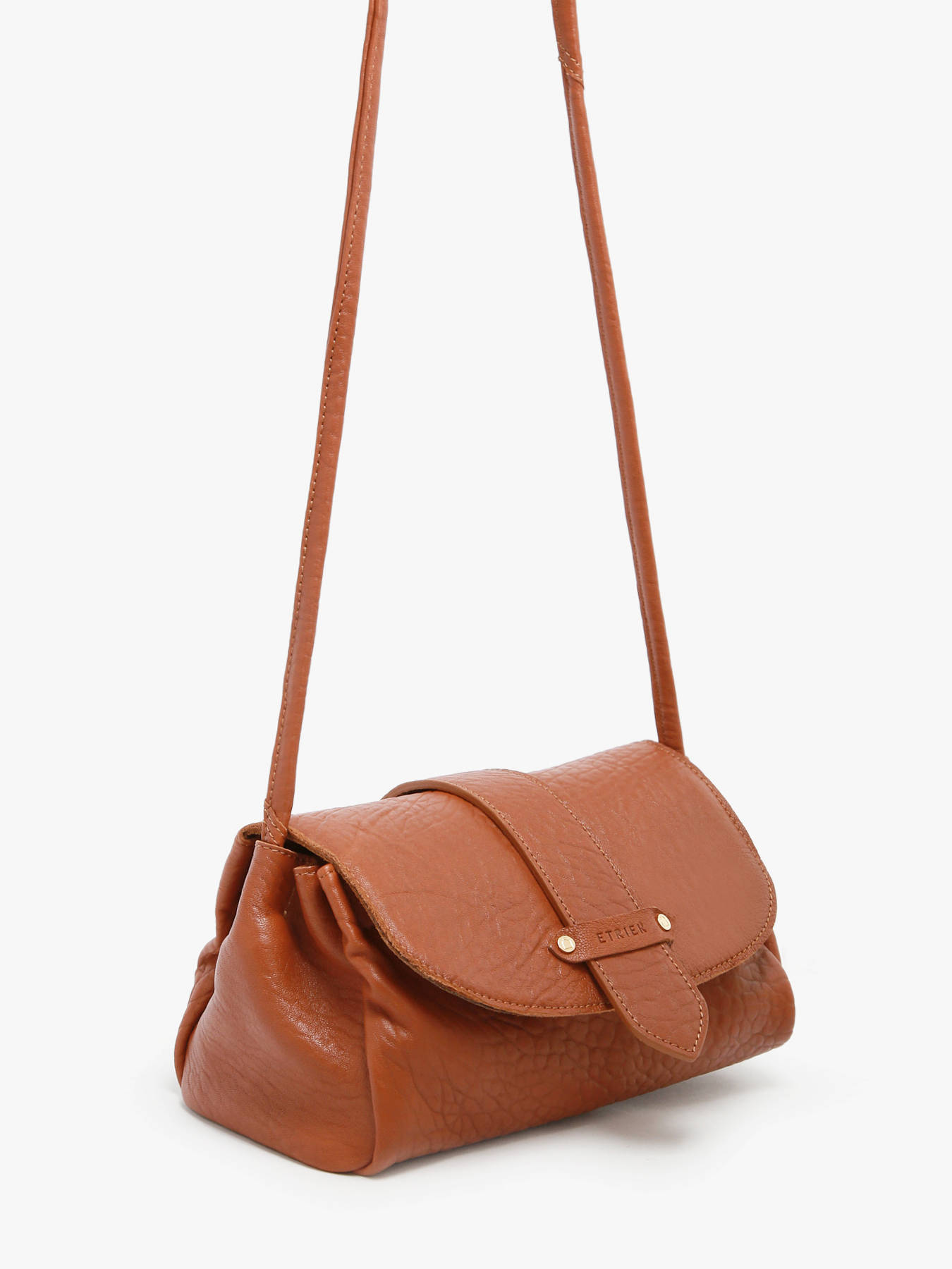 De AGNES-tas van ETRIER is vervaardigd uit Frans ""bubble"" schapenleer, maat M, met een flap voorzien van een drukknoop en een verstevigde bodem voor een optimale vormvastheid. De omkeerbare riempje, met een goudkleurige zijde en een zijde in bijpassend leer, wordt eenvoudig bevestigd dankzij twee kraagknopen en schuift in een achtervak dat speciaal hiervoor wordt ontworpen. De met leer gevoerde binnenkant bevat drie compartimenten, waaronder een centraal ritsvak, zodat uw persoonlijke spullen gemakkelijk kunnen worden georganiseerd. Het ETRIER-logo, in natuurlijk leer, is versierd met een klein Frans vlaggetje dat een elegante en onderscheidende vleugje toevoegt. De schouderriem is bij levering ingesteld op 65 cm, maar de lengte kan eenvoudig worden aangepast dankzij een discrete knoop aan de binnenkant van de tas. U hoeft enkel te trekken, de knoop los te maken, de lengte aan te passen en vervolgens de knoop opnieuw te leggen voor een perfect draagcomfort.